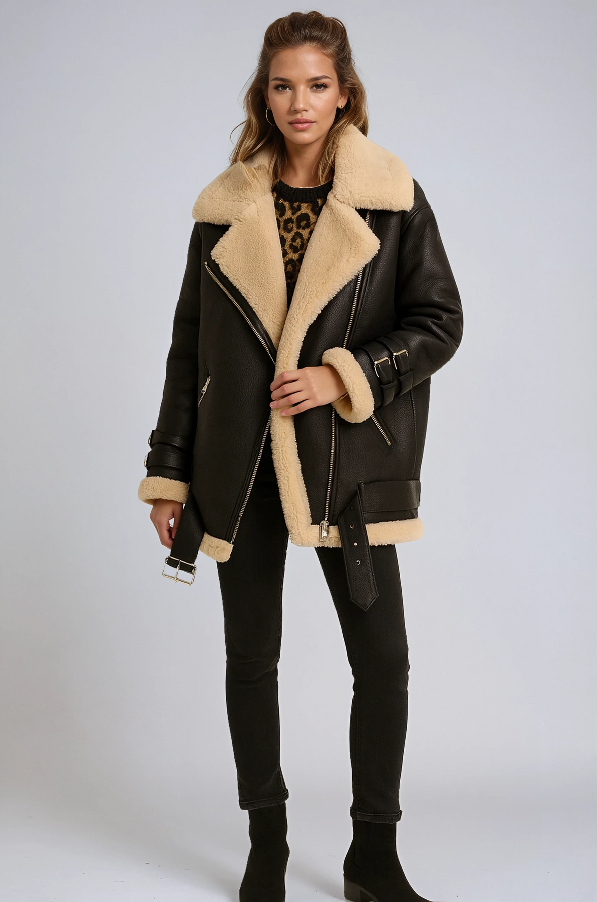 This faux shearling aviator jacket offers a warm, structured feel with a classic winter look.