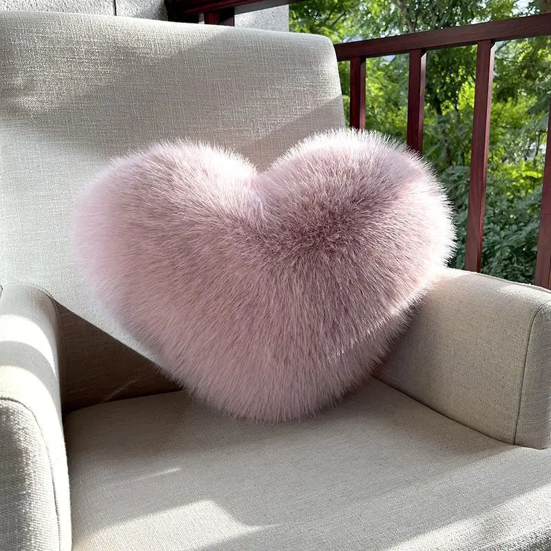 This heart-shaped decorative cushion features a soft faux fur exterior and a light, plush feel.